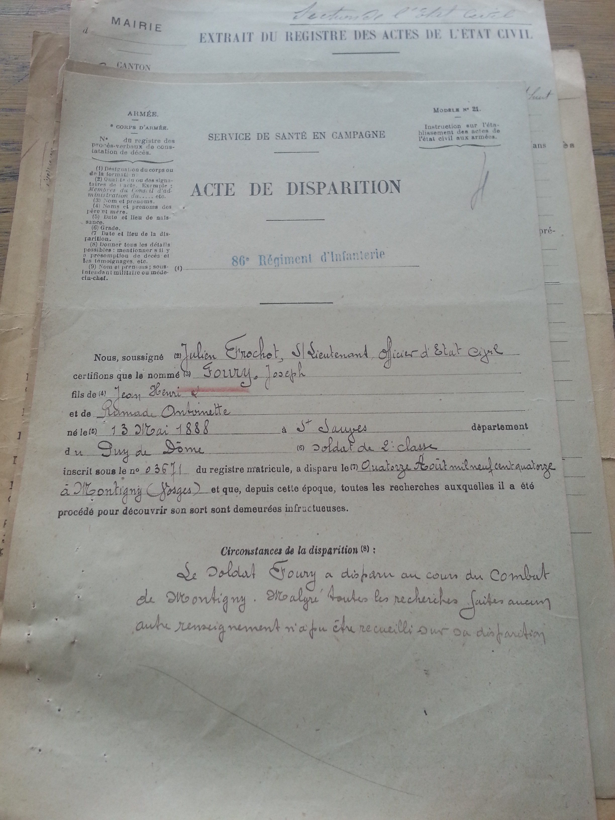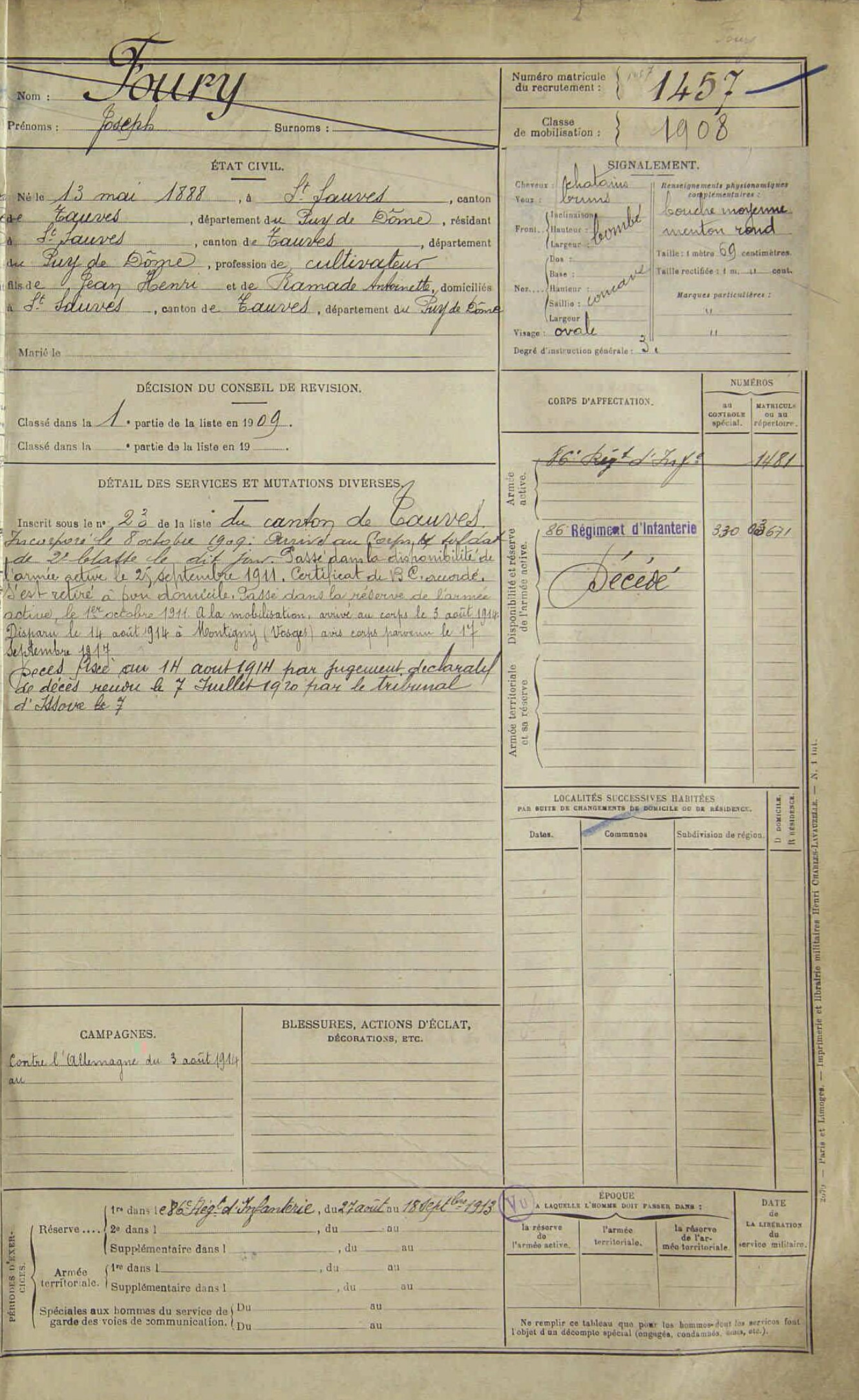 classe 1908 matricule 1457 du recrutement de Clermont-Ferrand, disparu à Montigny (54)