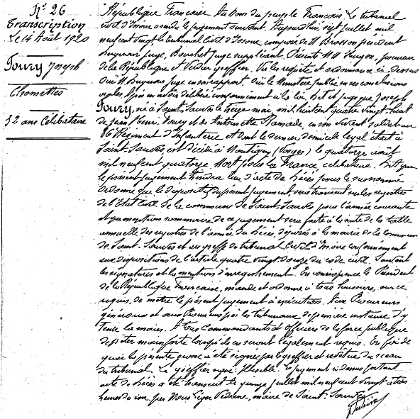 Par la suite, je pus également consulter aux archives départementales du Puy-de-Dôme [17 rue de Neyrat 63100 CLERMONT-FERRAND] le dossier de procédure (5 feuillets dont l'acte de disparition ci-dessous) du jugement déclaratif de décés prononcé par le tribunal civil d'Issoire le 7 juillet 1920.