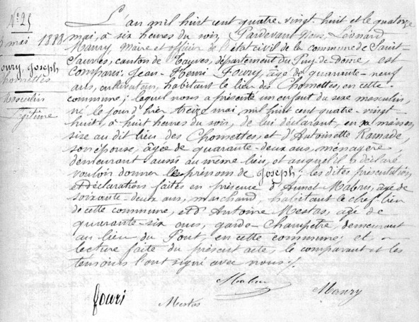 Ayant une date de décès, le 14 août 1914, je partais à la recherche de l'acte de décès de mon grand oncle ; celui-ci étant disparu, cet acte semblait a priori inexistant. Je m’intéressais donc dans un premier temps à son acte de naissance ; connaissant son âge lors de son décès (26 ans) je retrouvais "à tâtons" et avec la chance qu'il soit né à Saint-Sauves cet acte :