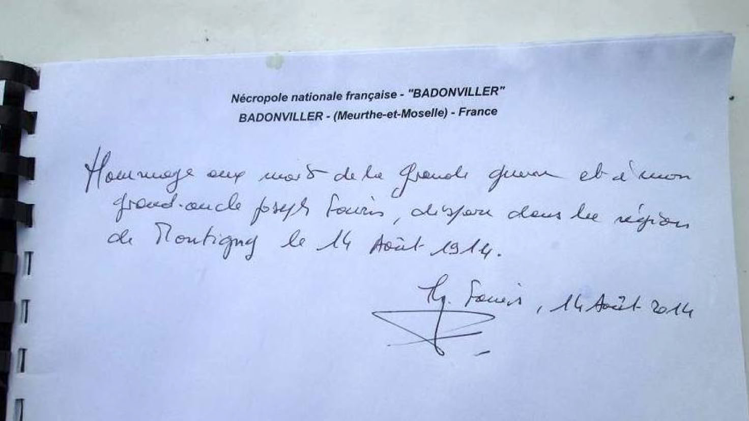 Le 17 octobre 2001, j'étais informé de la suite négative des recherches effectuées dans les archives des services de la direction régionale et du Ministère quant au lieu de sépulture ; le directeur régional adjoint, M. SCHMITT, me suggéra que "les restes mortels de ce militaire reposaient peut-être en tant qu'inconnu dans l'ossuaire de la nécropole Nationale la plus proche de son lieu de décès [Montigny Meurthe et Moselle] en l'occurrence la nécropole nationale de Badonviller." Cette nécropole, située au nord de Saint-Dié, a été créée en 1920 et s'étend sur 7.900 m2 ; 2.591 corps y reposent, répartis en 1.382 tombes et 1.209 en ossuaire. La majorité des morts tombés dans les combats des cols des Vosges sont inhumés dans cette nécropole. J’ai eu l’occasion de me rendre sur place à l’occasion du centenaire de la mort de mon grand oncle le 14 août 2014 :