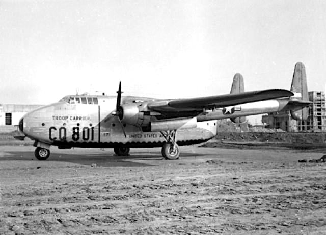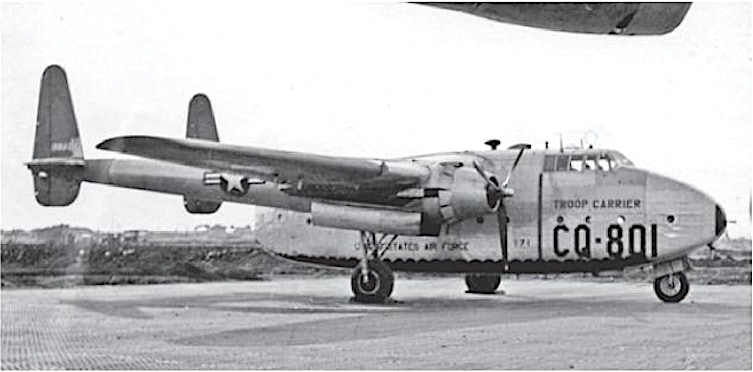 Surnommé le «wagon volant», l’avion en question, un C-82A Packet de l’US Air Force immatriculé CQ-801, était un cargo bimoteur avec un fuselage bi-poutre, construit par la compagnie Fairchild Aircraft. 223 exemplaires ont été assemblés entre 1944 et 1948, avant que le modèle ne soit retiré du service de l’US Air Force en 1954. Ce type d’aéronef était destiné principalement au transport de fret et de troupes ainsi qu’à l'évacuation sanitaire, notamment lors de la guerre de Corée. Sa capacité de charge était de 42 soldats ou 8,16 tonnes de fret.