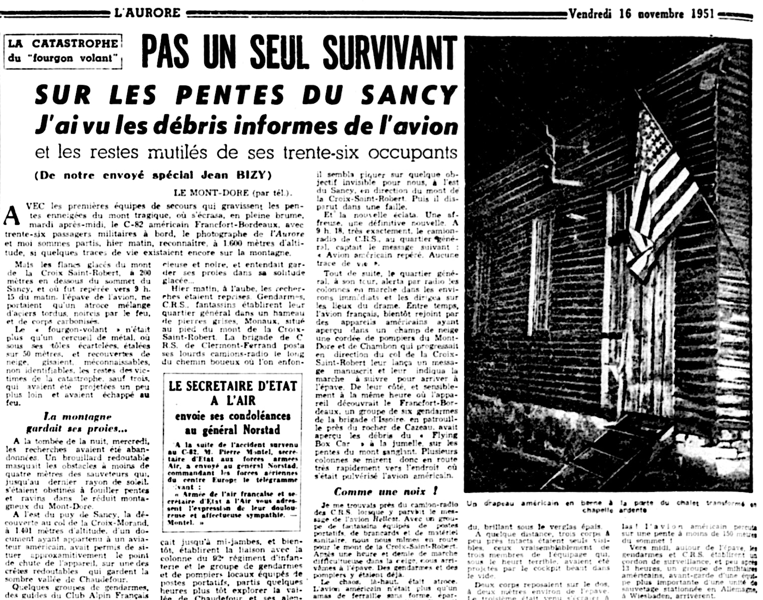 À 13 heures avait lieu un dernier hommage par les autorités et un détachement en armes de l’armée de l’air commandé par le capitaine PETIT. L’évêque Gabriel PIGUET prononçait la prière des morts et bénissait les cercueils, avant que ne retentissent la sonnerie aux morts et les hymnes interprétés par la fanfare du 92ème régiment d’infanterie commandée par le capitaine MONTORIOL. Les cercueils étaient embarqués dans quatre avions C-82 de l’US Air Force arrivés la veille à AULNAT et qui décollaient à 15 heures pour FRANCFORT, avant de rejoindre quelques jours plus tard les Etats-Unis.