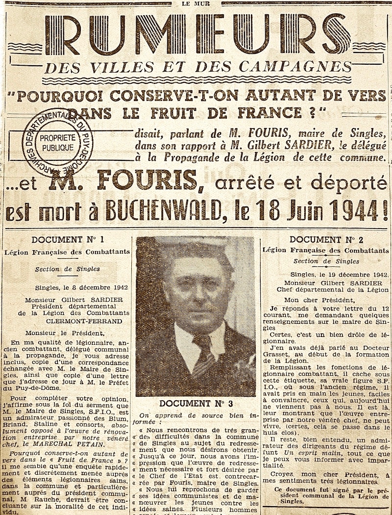 Le 14 septembre 1946, la dénonciation des opinions politiques du maire de Singles par la Légion Française des Combattants en 1943 est révélée dans un article du journal de la Résistance «Le M.U.R. d’Auvergne» sous la rubrique «Rumeurs des villes et des campagnes».