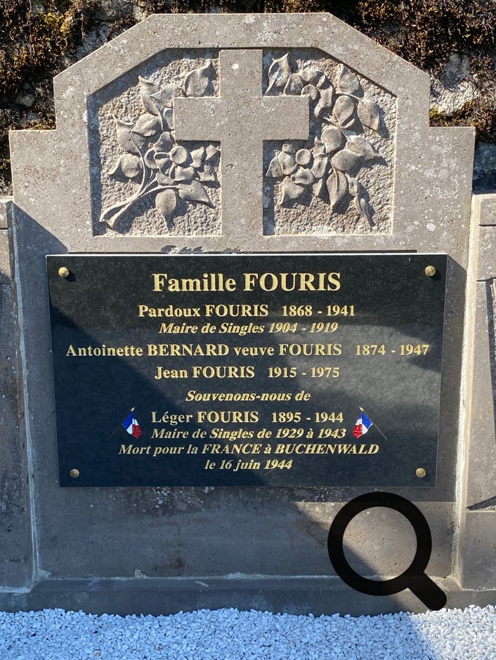 À Singles le 13 octobre 1943, Monsieur Léger Camille FOURIS, Maire de Singles, fut arrêté, et de là déporté en Allemagne au camp de Buchenwald où il est décédé le 18 juin 1944. Deux enquêtes eurent lieu, par la suite dès la libération, mais hélas, aucune n'aboutit à faire découvrir le ou les coupables et pourtant une arrestation eut lieu, mais celle-ci a été élargie... Je vous demande d'ordonner une nouvelle enquête, car dès le printemps 1943, Monsieur Jean FOURIS et son conseil municipal fut dénoncé à Vichy par un nommé X, comme conseil municipal communiste, briandiste, blumiste... Pour quelle raison n'a-t-on jamais demandé à celui-ci des explications pour son acte ? Pourquoi ne douterait-on pas que peut-être le 13 octobre 1943 il n'est pas étranger au débarquement allemande ici ? Veuillez prendre connaissance de la lettre ci-jointe adressée par ce monsieur à Mlle Raymonde FOURIS, fille de M. FOURIS Léger... par quel acte de remord ou de bonté... s'avance-t-il a intervenir, voire même verser une caution en faveur de FOURIS... à qui... les allemands étaient à ce moment maîtres de notre pays, X avait dont des relations avec eux, quelque chose semble laisser planer un drôle de doute, vu que de nombreux témoins, membres de l'ancien conseil municipal peuvent témoigner de la première dénonciation.